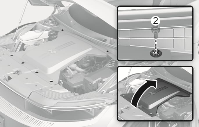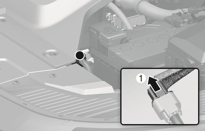 With the bonnet open, disassemble the external speaker connector (1) located on the right side. Remove the bolt (2) to remove the motor compartment cover.