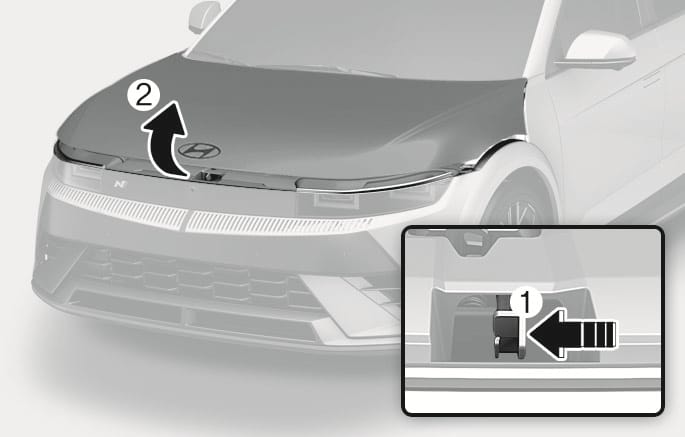 Go to the front of the vehicle, raise the bonnet slightly, push to the left the secondary bonnet release lever (1) inside of the bonnet centre and lift the bonnet (2).