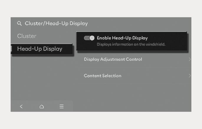 After turning on the Head-Up Display, you can change the settings of 'Display Adjustment Control' and 'Content Selection' of the Head-Up Display.