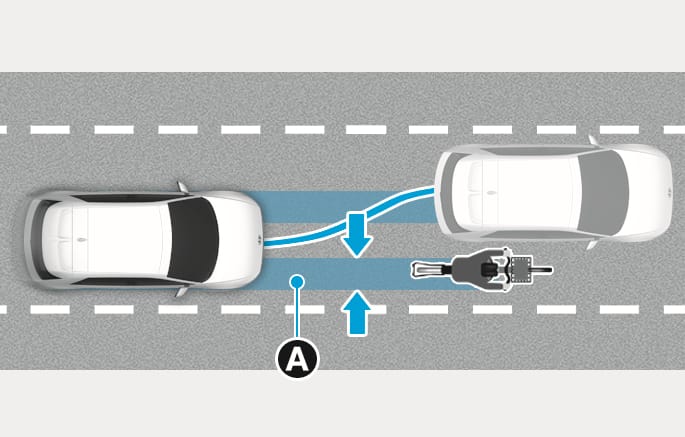 Evasive Steering Assist function helps avoid a collision with a powered two-wheeler, pedestrian or cyclist ahead in the same lane. When a risk of collision is detected, Evasive Steering Assist function will warn the driver and if there is space to avoid collision in the lane, it will assist the driver's steering.