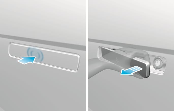 If you approach (within 39 in. (1 m)) the driver or front passenger’s door handle possessing the smart key, the outside door handles slide out and the doors are unlocked. In this case, Hazard Warning Flasher blinks twice and chime also sounds twice.