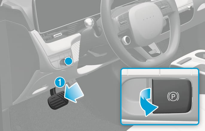Depress the brake pedal and release the parking brake manually with the EPB switch before you drive downhill or when backing up.
