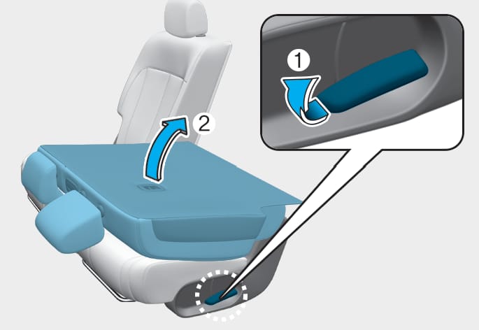 Pull up the seatback folding lever (1), then fold the seat (2) toward the front of the vehicle. When you return the seatback to its upright position, always be sure it has locked into position by pushing on the top of the seatback.