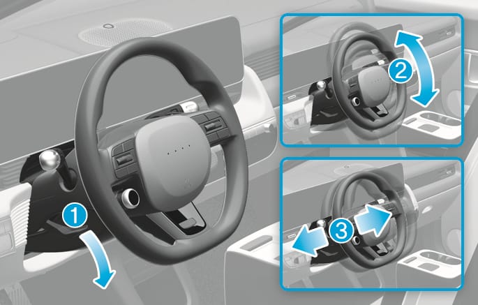 Adjust the steering wheel to the desired angle (2) and distance forward/back (3).