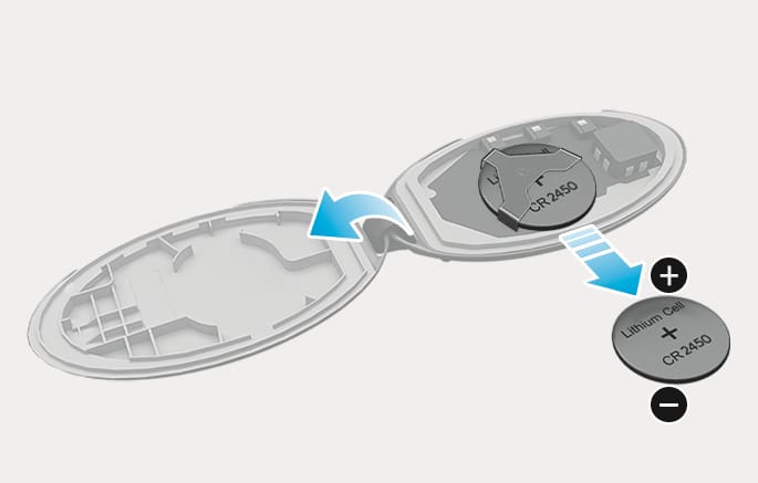Remove the old battery and insert a new battery. Make sure the battery position is correct. An improperly positioned battery may discharge the battery, causing smart key failure.
