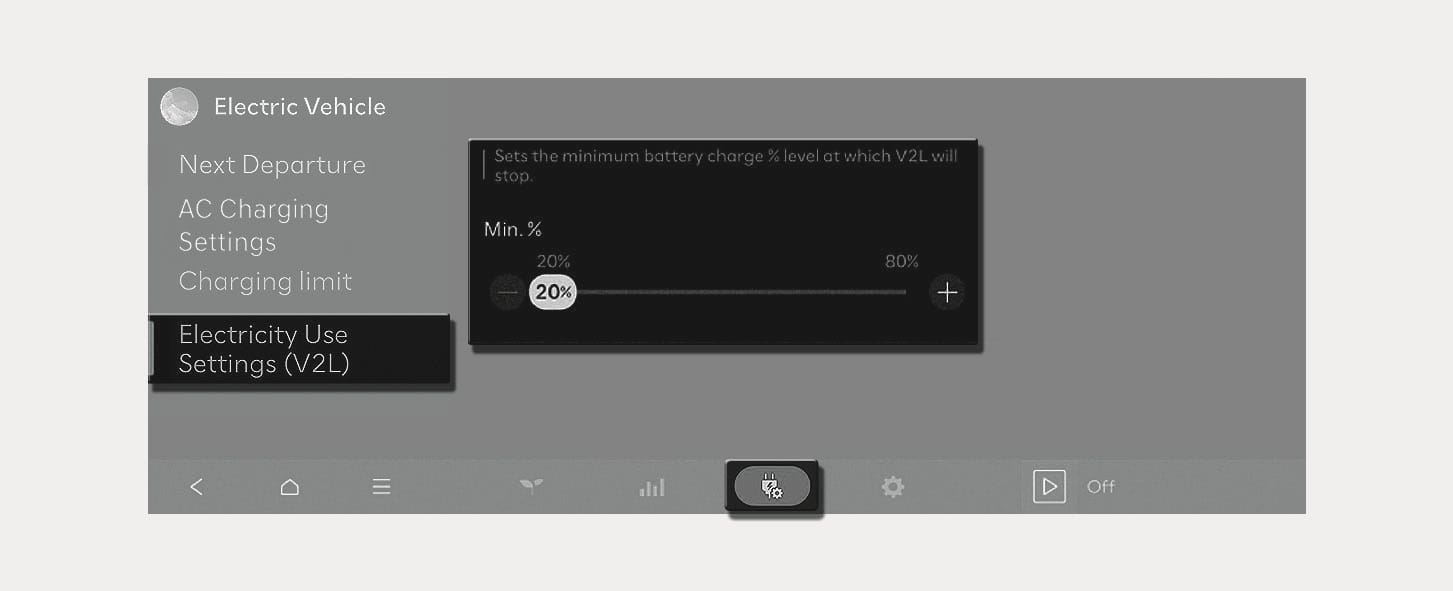 When the high voltage battery level reaches the set battery discharging limit, V2L function automatically cuts off electrical supply.
