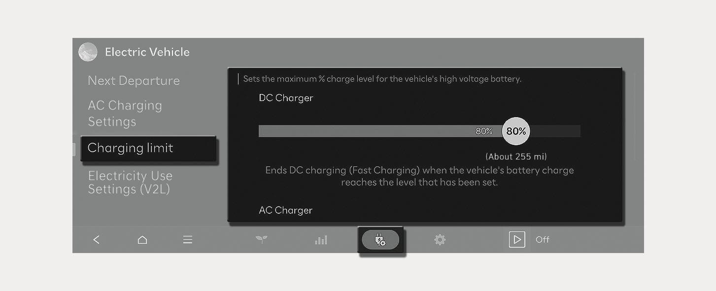 You can set the target battery charge level when charged with an AC charger or a DC charger.