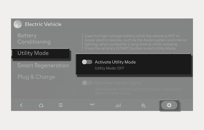 Utility mode allows the high voltage battery to be used instead of the 12 V battery for purposes other than driving. You can use the audio and lights of the vehicle without worrying about discharging the battery.