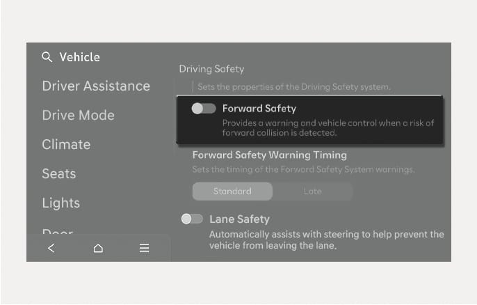 If "Forward Safety" is selected, Forward Collision-Avoidance Assist will warn the driver with a warning message, an audible warning depending on the collision risk levels. Braking assist will be applied depending on the collision risk levels. If "Forward Safety" is deselected, Forward Safety will turn off. The warning light (