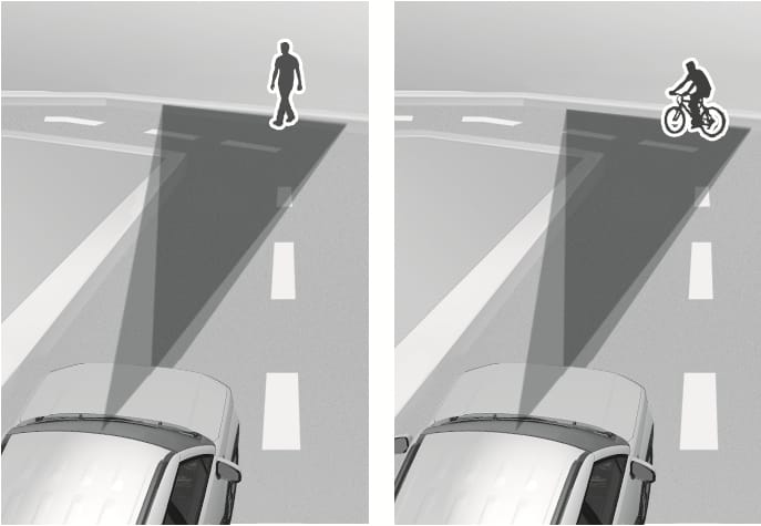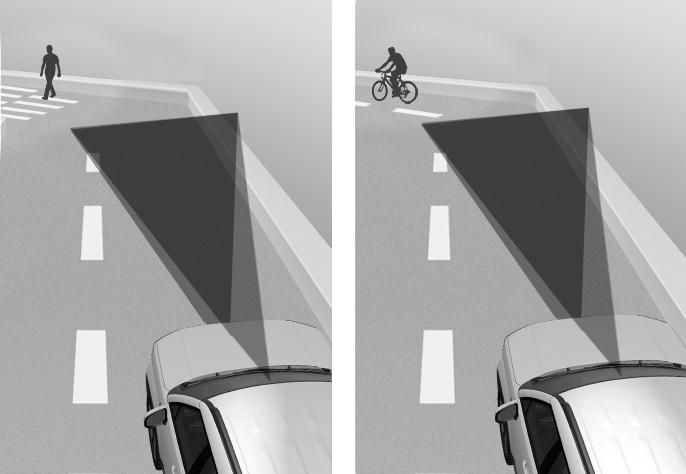 The illustration above shows the image the front view camera and front radar are capable of detecting as a vehicle, pedestrian and cyclist.