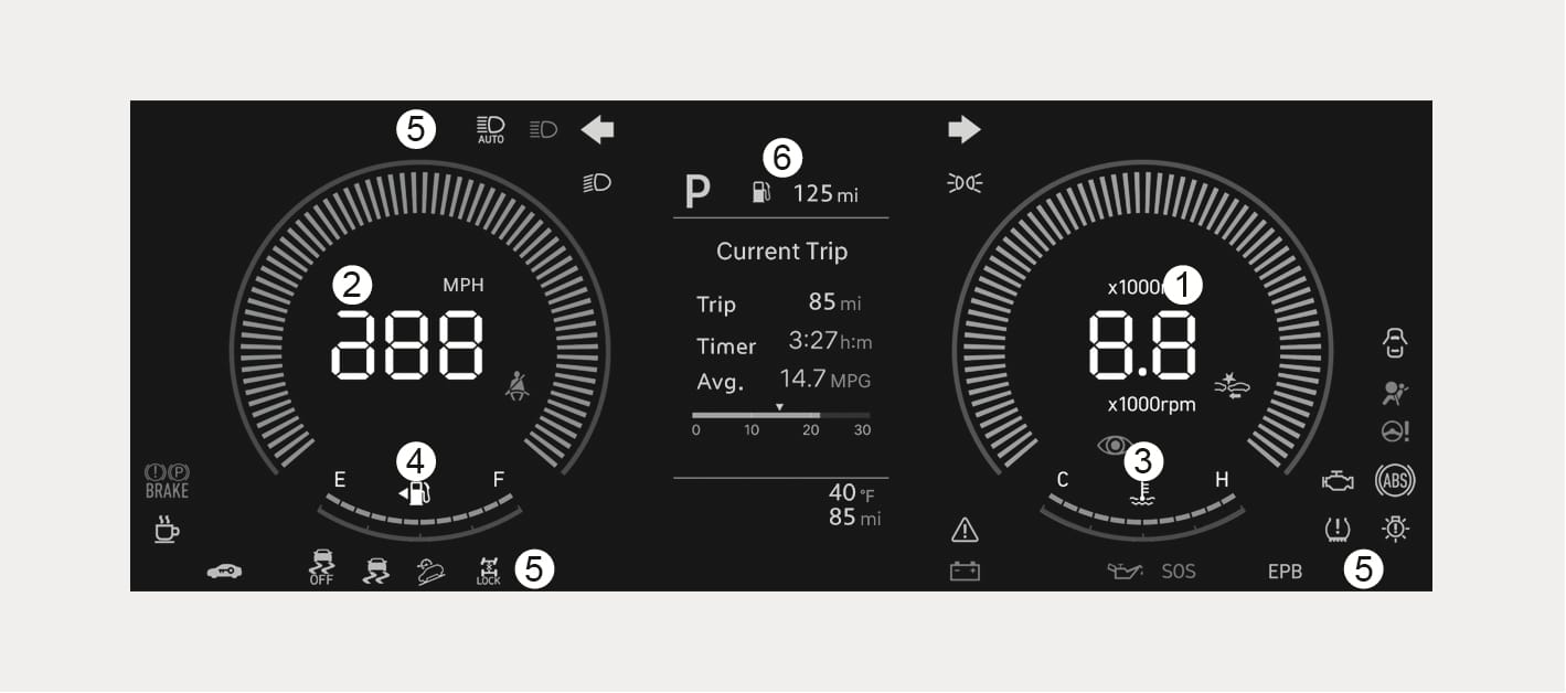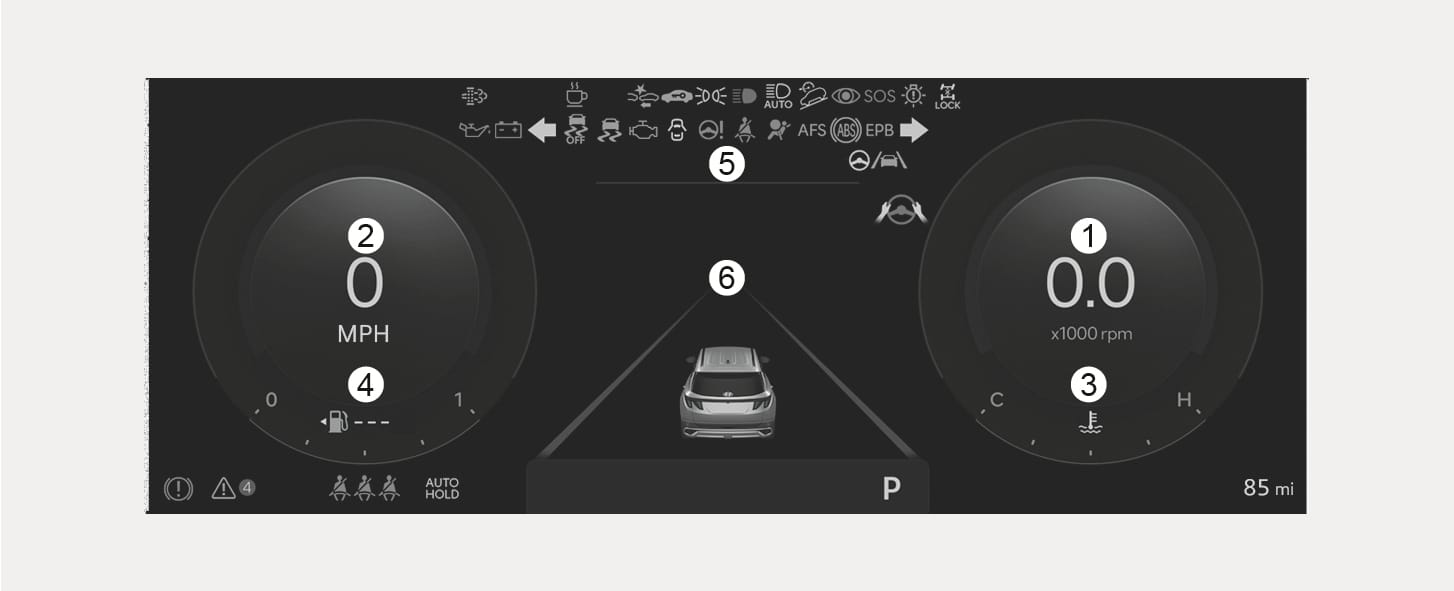 The actual cluster in the vehicle may differ from the illustration. For more information, refer to the "Gauges and meters" section in this chapter.