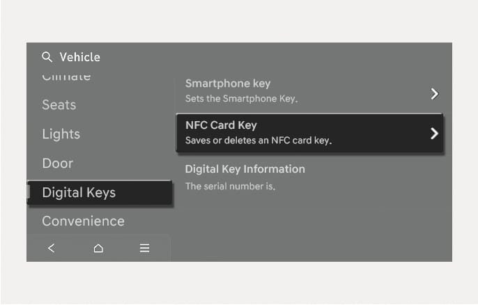 Register your card key by selecting Vehicle > Digital Keys > NFC Card Key > Save from the Settings menu in the infotainment system.