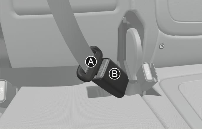 Insert the tongue plate (A) into the buckle (B) until an audible "click" is heard, indicating the latch is locked. Pull the shoulder portion of the belt to snug the belt across your hips and remove slack. Make sure the seat belt is not twisted.