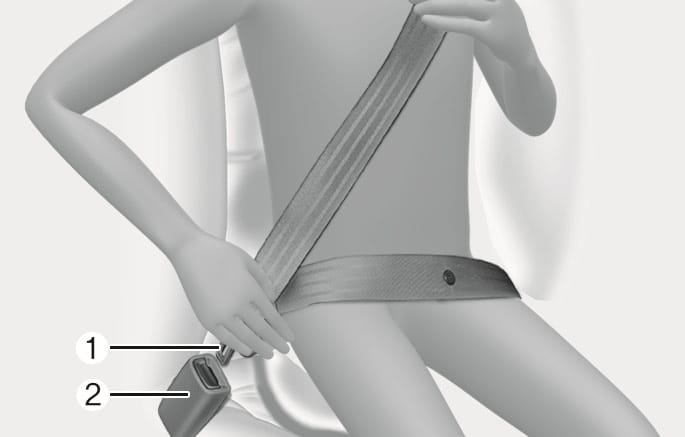 Pull the seat belt out of the retractor and insert the metal tab (1) into the buckle (2). An audible "click" sounds when the tab locks into the buckle. Make sure the seat belt is not twisted.