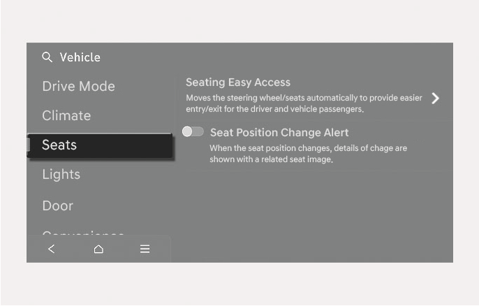 Seat Position Change Alert: When the seat position changes, details of the change are shown with a seat image.