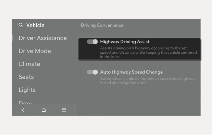 With the engine on, select or deselect Setup > Vehicle > Driver Assistance > Driving Convenience > Highway Driving Assist from the infotainment system to set whether to use each function.