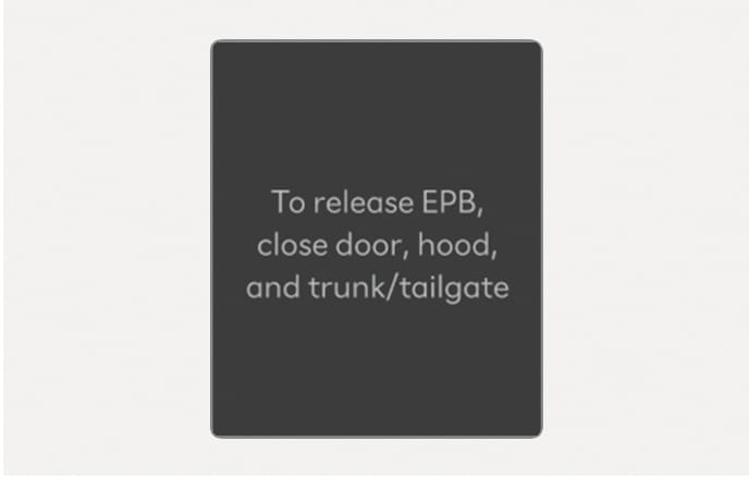 If the hood, liftgate, doors are open, and you try to drive with EPB applied, a warning sounds and a message appears.