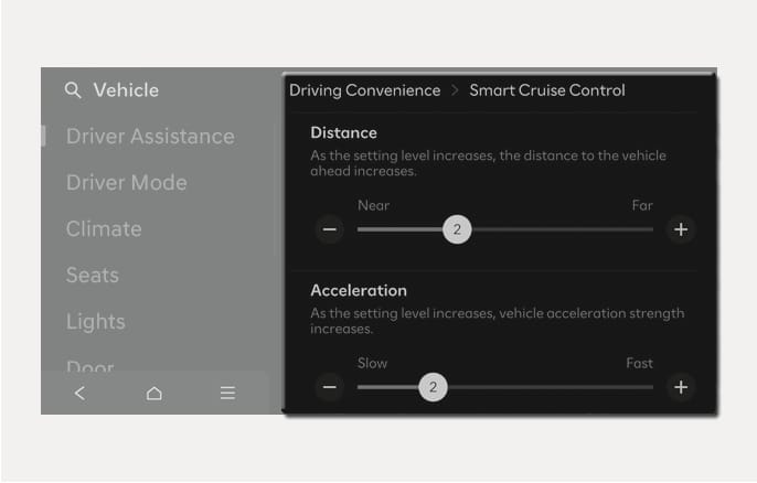 With the engine on, select Setup > Vehicle > Driver Assistance > Driving Convenience > Smart Cruise Control from the Settings menu in the infotainment system, you can change the vehicle distance, the acceleration, and the reaction speed manually.
