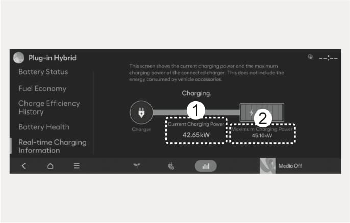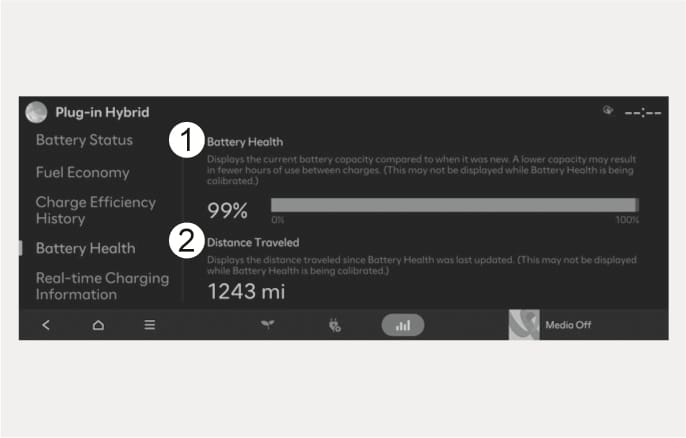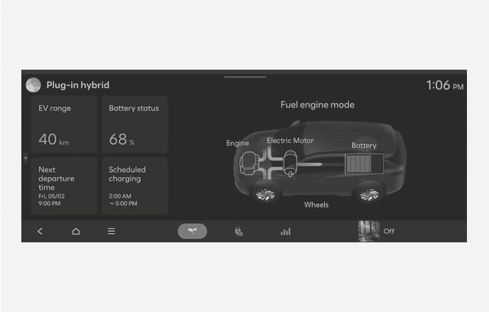 On the Home screen from the infotainment system, select Plug-in hybrid (PHEV) to set features related to your plug-in hybrid vehicle. (EV range, Battery status, Next departure time, Scheduled charging, Energy flow, etc.)