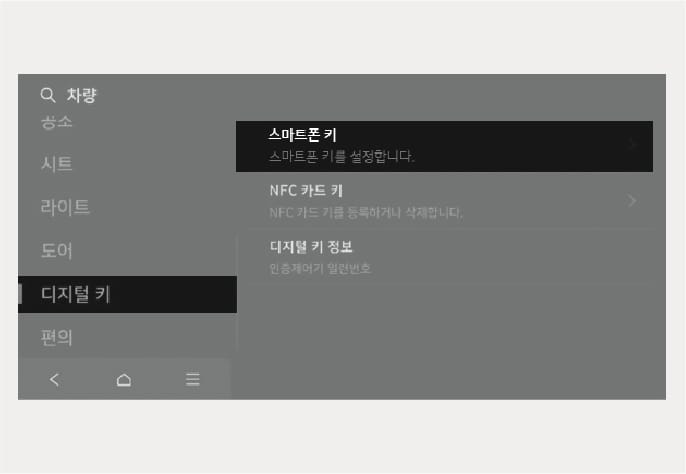 인포테인먼트 시스템에서 설정 > 차량 > 디지털 키 > 스마트폰 키 > 나의 스마트폰 키를 선택한 후 등록 버튼을 누르십시오.