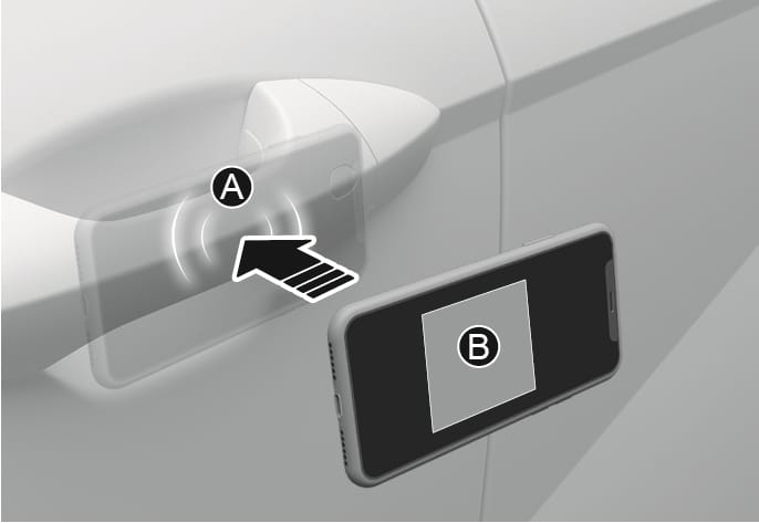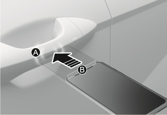 등록된 스마트폰의 뒷면에 있는 NFC 안테나를 운전석 또는 동승석 도어 핸들 인증 패드에 2초 이상 대면 도어가 잠금 또는 잠금 해제됩니다.