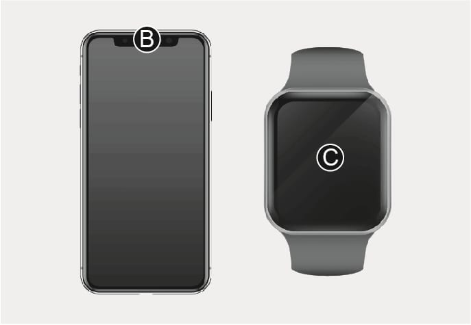 Apple iphone의 NFC 안테나는 기기 뒷면 최상단[B], Apple WATCH의 NFC 안테나는 화면 중앙[C]에 위치합니다.