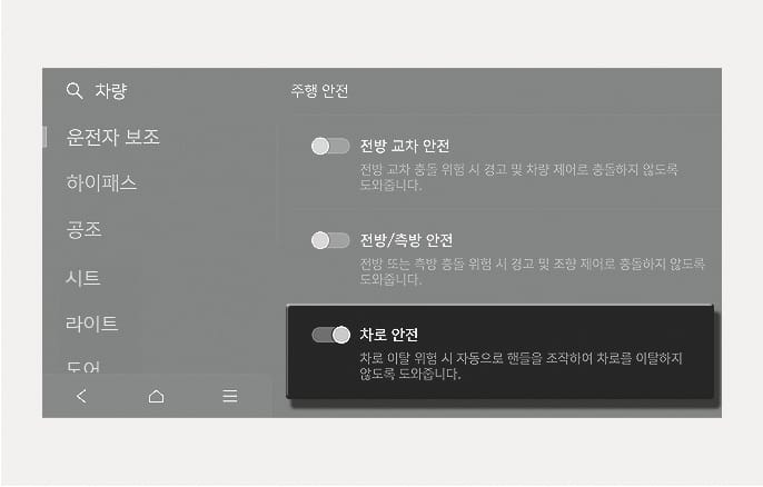 시동 ‘ON’ 상태에서 인포테인먼트 시스템의 설정 > 차량 > 운전자 보조 > 주행 안전을 차례로 선택하십시오. 기능의 사용 여부를 선택할 수 있습니다.