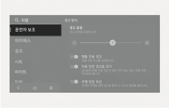 경고 음량과 핸들 진동 경고는 동시에 꺼지지 않습니다. 하나를 끌 경우, 다른 하나는 활성화 됩니다.