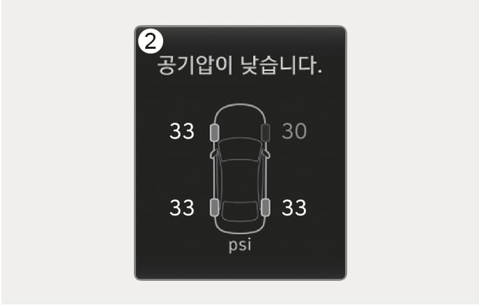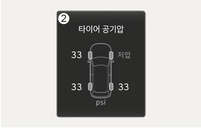 - 저압 타이어 경고등(켜짐)/TPMS 경고등(깜빡인 후 켜짐)