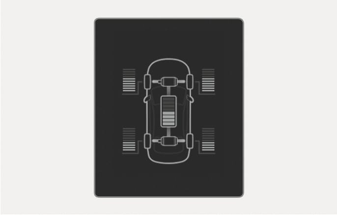 자동 4WD 모드가 작동하면 전륜과 후륜의 구동력 배분 상태를 알려주는 화면이 표시됩니다. 자세한 내용은 6장 내 '통합주행 모드 시스템 (4WD)'를 참고하십시오.