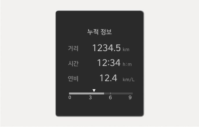 수동으로 정보를 초기화한 이후의 누적 주행 거리, 주행 시간, 주행 연비, 순간 연비가 표시됩니다.