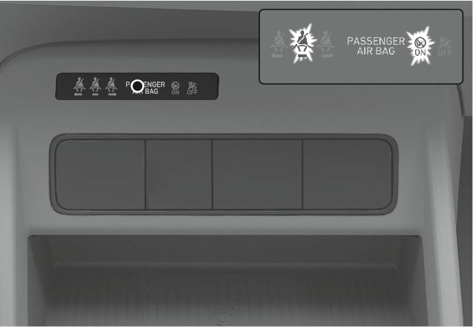 L'indicatore di attivazione/disattivazione dell'airbag anteriore del passeggero si accende per circa 4 secondi dopo che il pulsante Start/Stop del motore viene portato in posizione ON. Se il pulsante Start/Stop viene premuto in posizione ON entro 3 dallo spegnimento del veicolo, l'indicatore non si accende.