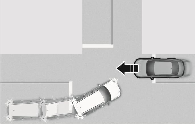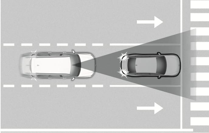 La funzione Svolta a incrocio può contribuire a evitare una collisione con un veicolo in arrivo in una corsia adiacente quando si svolta a sinistra (guida a sinistra) o a destra (guida a destra) in un incrocio con il segnale di svolta acceso, applicando la frenata di emergenza.